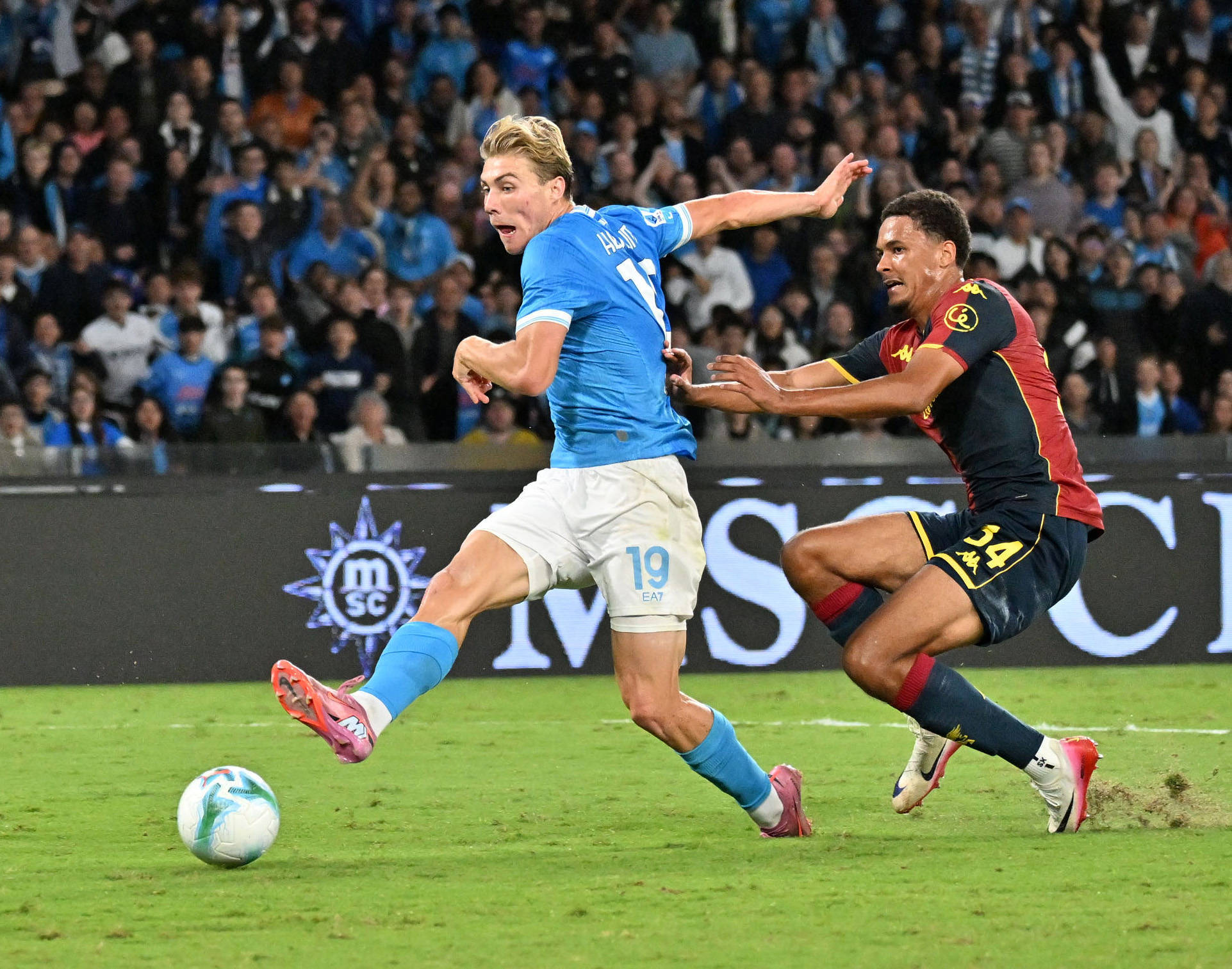 10月5日,那不勒斯队球员霍伊伦(右)与热那亚队球员马尔坎达利在比赛中拼抢。 新华社发